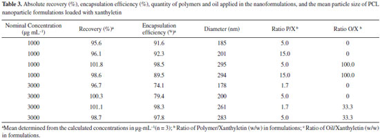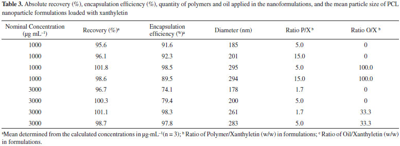 The precision of the method was investigated by assay of the degree of repeatability of the analytical method under normal operational conditions of the analyst and of the equipment. Therefore, precision was measured by the analysis of three different standard solutions (0.18, 4.50, and 7.50 µg mL-1) in quintuplicate (n = 5) on three nonconsecutive days (n = 15). The results are described in Table 2 as Recovery (%) and RSD. Similar to the accuracy, the samples used to determine the precision were assessed within the linear working range. The RSD data for repeatability at each standard solution concentration level intra-day (n = 5) ranged from 0.3% to 2.0%, showing an inter-day (n = 15) average result of 1.12%. The results indicate a very high precision for the analytical method. Precision data express the importance that random errors may have on the performance of the method and that it may also be expressed at different levels. The ANOVA output resulted in a calculated F of 1.53, which was lower than the critical value of 5.14, indicating that the results obtained on different days and for different concentration levels were not statistically different. Limits of Quantification (LOQ) and Detection (LOD) The LOQ and LOD were calculated according to the standard deviation (sd = 0.955) and the slope (S = 102.9) of the calibration curve. The LOD and LOQ were 0.03 and 0.09 µg mL-1, respectively. The LOQ was smaller than the first point of the calibration curve (< 0.15 µg mL-1), confirming that the method used was linear, accurate, and precise within the working range.28,36,37 Application of the developed method for the quantitation of xanthyletin in nanoparticles The validated method was successfully applied in the determination of the absolute recovery and encapsulation efficiency of xanthyletin in various NC and NS, as listed in Table 3. Nanoparticles were prepared using various amounts of both PCL polymer and isodecyl oleate (thereafter called oil only) that ranged from 1.7 to 15.0 and 0 to 100.0 with respect to the ratios polymer/xanthyletin (w/w) and oil/xanthyletin (w/w), respectively. The amount of substance encapsulated is dependent on several factors such as substance affinity for the polymer, type of polymer and oil, and substance solubility in the oily core.38,39