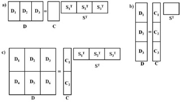 ![]() Figura 3. Modelo bilinear de MCR aumentado (a) pelas linhas, (b) pelas colunas e (c) pelas linhas e pelas colunas ao mesmo tempo