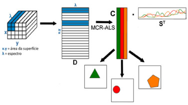![]() Figura 4. Esquema do tratamento dos dados de imagem hiperespectral por MCR-ALS, resultando nos espectros puros otimizados de cada espécie química resolvida (ST) bem como seus respectivos perfis de concentraçao na superfície da amostra (C)