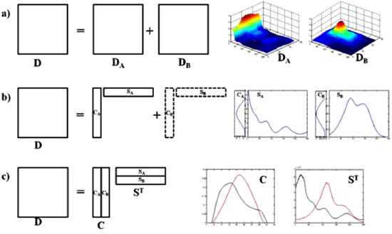 Figura 1. Modelo de medidas para um sistema de dois componentes (Adaptado de de Juan e Tauler)3. (a) Descrito como um modelo de somatória de contribuiçoes de sinais puros; (b) Descrito como um modelo de somatória de díades de perfil puro de concentraçao e espectro; (c) Descrito como um modelo bilinear de perfis de concentraçao e espectros