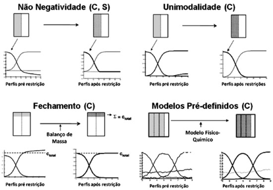 Isso significa que a díade de perfis resolvidos (ci, si) para cada componente puro pode apresentar perfis como os procurados, porém ki vezes menores, (1/ki)ci, ou maiores, kisiT. A extensão da ambiguidade pode ser significantemente diminuída ou até suprimida pelo uso de restrições. Quanto mais restrito é um sistema, menos possibilidades de combinações de perfis podem preencher as condições de forma e intensidade requeridas, ajustando de forma otimizada o conjunto de dados D. A ambiguidade tem sido um dos maiores problemas do MCR. Somente recentemente tem havido tentativas sólidas para avaliar a extensão desse fenômeno nos perfis resolvidos de MCR.33-35 Recentemente foi criada por Jaumot e Tauler uma ferramenta utilizada para avaliar e quantificar a ambiguidade rotacional, chamada de MCR-BANDS.33 De um modo geral, a ambiguidade é dependente dos componentes e dos perfis e, dentro do mesmo conjunto de dados, é possível encontrar componentes ou perfis com falta de ambiguidade e outros que a possuam em uma grande extensão. Algumas das últimas tendências optam por determinar cada componente separadamente com os limites máximo e mínimo das bandas de soluções mais adequadas para a díade de perfis resolvidos.36 A ideia geral é encontrar os limites das díades dos perfis que fornecem as contribuições máximas e mínimas dos componentes do sinal global medido. Os limites máximo e mínimo devem corresponder aos perfis que respeitam as restrições e devem ser parte do conjunto global de perfis incluindo todos os componentes e reproduzindo o conjunto de dados com o melhor ajuste.36 Outras metodologias questionam o quanto os limites mínimos e máximos realmente aproximam todos os perfis viáveis possíveis e, se definidos como máximo e mínimo da contribuição do sinal, se eles realmente representam as melhores soluções. No entanto, independente da ambiguidade nas soluções, uma fonte comum de incerteza nos resultados vem do erro nas medidas experimentais. Uso de restrições As diversas formas de aplicação dos métodos de resolução de curvas mostram que a ambiguidade, inerente à decomposição na análise de fatores de uma matriz de dados bilineares, pode ser apenas parcialmente superada pelo uso de restrições. Lawton e Sylvestre37 foram os primeiros autores a demonstrar que, sob restrições como a não negatividade, um pequeno número de soluções é possível. O método foi testado para uma mistura de 2 componentes e mais tarde o teste foi feito para 3 componentes por Borgen e Kowalski,38 mostrando-se bastante eficiente quanto ao número de respostas possíveis. Desde os primeiros estudos em resolução de curvas, a seletividade tem sido um dos aspectos mais relevantes a serem considerados na recuperação de soluções verdadeiras. Um ponto importante no uso de seletividade está no fato de que a matriz original pode ser subdividida em duas matrizes menores, reduzindo assim a complexidade da mistura. Nas regiões onde o posto da matriz está perto da unidade, a ambiguidade relacionada à decomposição na análise de fatores é completamente resolvida. Dessa forma, a detecção dessas regiões e o uso da seletividade são de grande importância para a resolução de problemas em MCR.16,17 Além da não negatividade para concentração e sinal, outras restrições gerais como uni-modalidade, fechamento (closure) e inclusão de modelos pré-definidos (hard-modeling) são propostas.3 A utilização das informações de seletividade e das restrições diminui consideravelmente o conjunto de soluções possíveis na decomposição dos dados. Contudo, não há garantias de que as soluções verdadeiras são obtidas para um caso geral. Em particular, quando não há seletividade nas duas ordens (C e ST) de nenhum dos componentes da mistura, não há garantia de que as soluções corretas serão recuperadas.3,13 Em adição às restrições clássicas de não-negatividade, unimodalidade, fechamento (closure) e restrições de igualdade ligadas à seletividade ou ao uso de perfis conhecidos, a contribuição mais notável tem sido a introdução de modelos pré-definidos (hard-modeling). A Figura 2 apresenta de forma resumida o funcionamento de algumas das restrições mais utilizadas.3