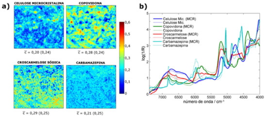 Os perfis de concentração relativa da forma polimórfica III do fármaco Carbamazepina (CBZ) e dos principais excipientes (Celulose microscristalina, Copovidona e Croscarmelose sódica) em uma formulação de comprimido foi resolvido por meio de medidas de espectroscopia de imagem no infravermelho próximo (NIR, do inglês Near InfraRed) seguido do tratamento dos dados por MCR-ALS.70 Os espectros puros de cada uma das espécies químicas da formulação foram utilizados como estivas iniciais de ST e as restrições empregadas no processo de otimização foram não negatividades em C e ST além do closure (uma vez que o número total de espécies químicas na amostra era previamente conhecido). Os mapas de concentração dos compostos resolvidos pelo MCR-ALS no comprimido, assim como os espectros puros recuperados, estão ilustrados na Figura 5.70