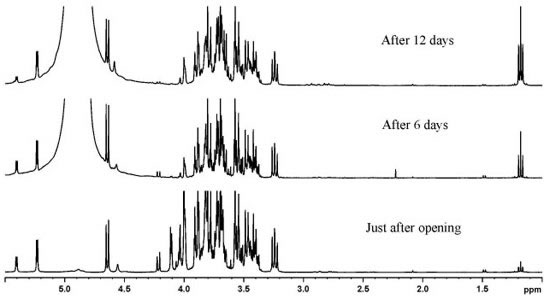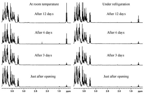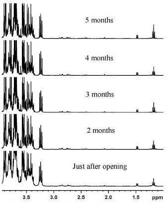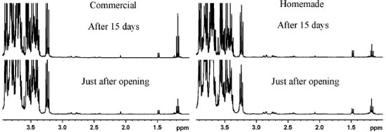In southern Brazil, the consumption of grape juice is considerable, and many traditional families make their own grape juice during harvest season and store it for the year. Therefore, homemade grape juices were evaluated for ethanol production by 1H NMR spectra during storage, prior to opening the bottles at room temperature, and under refrigeration after opening the bottles. The 1H NMR spectra of unopened homemade grape juices stored for five months at room temperature revealed no increase in ethanol content (Figure 3). After the bottles had been opened, homemade juice samples were stored under refrigeration for 15 days, similar to commercial ones. The 1H NMR analysis showed no increase in ethanol content during storage time. When homemade grape juices were compared to commercial samples without addition of sucrose and preservatives, the intensification of the ethanol signal in the 1H NMR spectra was observed for commercial juices but not for homemade juices (Figure 4). This shows that the sterilization process of homemade grape juice, as described in the experimental section, is very efficient in comparison with the industrial method. Therefore, it is possible to store homemade grape juices for a long time prior to consumption, both before and after the bottles are opened. These observations support the hypothesis of possible yeast contamination during production of commercial grape juices and/or failures in sterilization process.