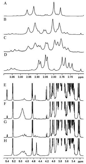 ![]() Figure 5. Representative 1H NMR spectra showing the inconsistencies between chemical compositions and the information provided on labels of commercial grape juices. A-D, Citric acid detection in samples B and C (with no specification of citric acid addition on the labels) in comparison with acidified commercial (A) and homemade (D) samples. E-H, Sucrose detection in samples F and G (specified as unsweetened on the labels) in comparison with sweetened commercial (E) and homemade (H) samples