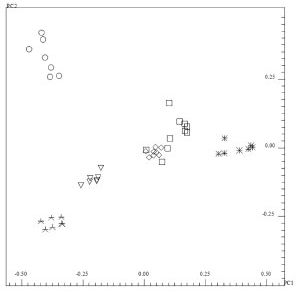 ![]() Figure 6. PC1 (64.61%) versus PC2 (20.45%) scores plot of the chemometric analysis over 1H NMR spectra of grape juice, showing in PC1 the similarity between the commercial (▽, ○, *, □ and ◊) and the homemade (*) grape juice samples