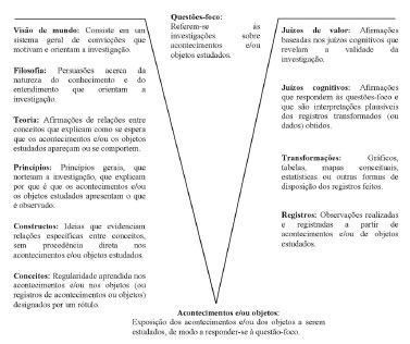 O lado direito corresponde ao domínio metodológico, sendo constituído pelos seguintes elementos: registros, transformações, juízos de valor e juízos cognitivos. Os registros dos eventos estudados são apresentados no lado direito, a partir dos quais se podem obter dados. As transformações desses mediante a elaboração de gráficos, de correlações e de categorizações, permitem a formulação de juízos cognitivos, isto é, respostas às questões-foco.5 Na base do Vê, encontram-se os objetos ou acontecimentos a serem estudados. Estes podem acontecer naturalmente ou serem provocados, de modo que se possam fazer registros dos mesmos. Tais elementos permitem ligar a nossa experiência a qualquer parte do universo, uma vez que tudo o que há no universo se trata de um acontecimento ou de um objeto.5 As questões-foco - questões básicas ou questões-chave - situam-se estrategicamente no centro do Vê, por pertencerem a ambos os lados. Indicam o conjunto de juízos cognitivos que se deseja construir, quais os conceitos e princípios necessários para a investigação e deve sugerir o principal acontecimento de interesse que vai ser estudado e registrado.6 Aplicações do diagrama V em aulas teórico-experimentais O uso do diagrama V em aulas teórico-práticas vem sendo relatado por diversos autores. Dentre as aplicações propostas, destacam-se aquelas referentes ao emprego do Vê como: