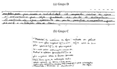 ![]() Figura 4. Descrição do modelo da dissolução de sais em água elaborado pelos alunos dos grupos D e C