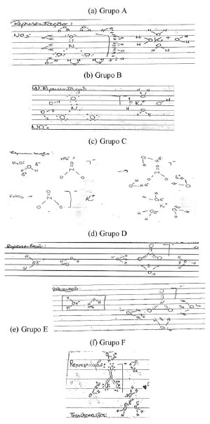 Vale destacar que os alunos dos grupos D e E aprofundaram um pouco mais nas explicações do processo de dissolução, ao relatarem que as moléculas de água apresentam um polo positivo e um negativo, e interagem por "pontes de hidrogênio", sendo estas as responsáveis pela interação das moléculas de água com os íons que formam o soluto. Contudo, não se observou uma explicação para o suposto "abandono" dos íons do soluto do retículo cristalino e suas dispersões para a massa líquida. Embora os fatores entrópicos e entálpicos como as energias de hidratação e solvatação não tenham sido discutidos com os alunos, o grupo C revelou que a solubilidade está relacionada com a "intensidade" da interação entre as espécies químicas do soluto e do solvente. Assim, segundo eles, se a interação entre essas espécies químicas for maior do que aquela presente nas espécies soluto-soluto ou solvente-solvente, haverá a solubilização do soluto no solvente. A "intensidade" da interação entre o soluto-solvente foi explicada em termos do conceito de polaridade. Para tal, fizeram uso do conceito de eletronegatividade. Assim, os estudantes do grupo C destacaram que a polaridade da molécula de água se deve à diferença de eletronegatividade entre o átomo de oxigênio e de hidrogênio. As discussões apresentadas nos parágrafos antecedentes forneceram indícios da ocorrência de uma aprendizagem significativa, uma vez que os alunos conseguiram estabelecer relações entre os conceitos ensinados (solubilidade e dissolução) com aqueles que eles já possuíam em sua estrutura cognitiva (polaridade e eletronegatividade), atribuindo significado à nova informação. A aprendizagem significativa revela-se quando se possui a consciência de que os elementos do lado esquerdo do Vê tem por objetivos orientar as ações do lado direito e promover a interação entre aquilo que os alunos já conhecem (lado esquerdo), e os novos conhecimentos que estão sendo produzidos (lado direito). Tal interação é mediada pelos acontecimentos e pelos objetos que são a base da produção de todo o conhecimento.4,5 Assim, para se ter um indicativo mais significativo da aprendizagem dos alunos, deve-se ter uma ideia das relações que os mesmos estabelecem entre os dois lados do Vê modificado. Ao comparar a descrição do modelo e a representação, observou-se que a maioria dos grupos propôs o mesmo tipo de representação. Isso pode estar relacionado ao fato de que não foi proibido o contato entre os mesmos. No entanto, alguns erros conceituais foram identificados. As representações dos alunos, para o processo de dissolução do nitrato de potássio em água, estão apresentadas na Figura 5.