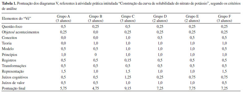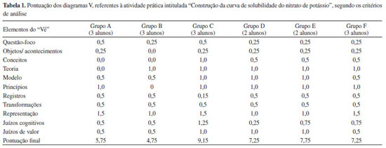 DESENVOLVIMENTO DA ATIVIDADE EXPERIMENTAL O estudo foi realizado com 16 alunos ingressantes em um curso de Química Licenciatura. A atividade de elaboração dos diagramas V ocorreu após a realização de uma atividade prática intitulada "Determinação da curva de solubilidade do nitrato de potássio". Os Vês foram construídos em grupo de dois ou três alunos, sendo dois do primeiro tipo e quatro do segundo, mantendo-se aqueles grupos que trabalharam na realização do experimento. Antes da elaboração do Vê modificado, buscou-se apresentar aos alunos o Vê originalmente proposto por Gowin, e orientá-los no processo de construção dos mesmos. Para isso, foram preparadas duas aulas de cinquenta minutos cada uma, nas quais se discutiram os significados dos elementos do Vê, da sua forma e da articulação entre os aspectos teórico-conceituais e metodológicos. Foram também compartilhados exemplos de diagramas V referentes a conteúdos da área da ciência química, a partir dos quais se discutiu a natureza do conhecimento produzido. Após as considerações sobre a metodologia de elaboração dos Vês segundo o modelo proposto por Gowin, fizeram-se discussões sobre a inserção dos novos elementos e sua importância no processo de construção do conhecimento químico. Posteriormenete, iniciaram-se as atividades de elaboração do Vê modificado. O primeiro diagrama V modificado elaborado pelos estudantes referiu-se à atvidade prática em questão. O objetivo do referido experimento foi coletar dados para a construção da curva de solubilidade do nitrato de potássio. O procedimento experimental consistiu em preparar, em tubos de ensaio, 8 soluções aquosas de nitrato de potássio com as seguintes massas - 5,0 g, 4,5 g, 4,0 g, 3,5 g, 3,0 g, 2,5 g e 2,0 g, 1,5 g. Após o preparo das soluções, as mesmas foram aquecidas em banho-maria até a dissolução do sal e, em seguida, resfriadas em temperatura ambiente até o início da cristalização do nitrato de potássio. As temperaturas nas quais se observou o início da cristalização foram anotadas para a confecção da curva de solubilidade. Para a elaboração do Vê modificado, foi proposta a seguinte questão-foco: "Como se comporta a solubilidade do nitrato de potássio em água, com a temperatura?". A fim de auxiliar os alunos na elaboração do referido instrumento e de uma resposta à questão-foco, foram feitas algumas discussões teóricas referentes ao conceito de solubilidade. Tais discussões foram necessárias devido ao fato de que nenhuma abordagem teórico-conceitual havia sido realizada pelo professor antes, durante ou após a realização do experimento. As discussões teóricas abordaram sobre conceitos-chave, tais como solubilidade, curva de solubilidade, temperatura, coeficiente de solubilidade, polaridade e interações intermoleculares. Para isso, foram utilizados dois vídeos explicativos, um que abordou os conceitos de solução, solubilidade e curva de solubilidade,21 e o outro, que se referiu a uma animação do processo de dissolução do cloreto de sódio e água.22 Critérios de análise do diagrama V modificado Os critérios de análise dos diagramas V adotados neste estudo foram baseados naqueles propostos por Novak e Gowin e Gowin e Alvarez.4,23 Vale ressaltar, entretanto, que algumas modificações foram realizadas em decorrência das modificações feitas no Vê e da natureza das construções apresentadas pelos alunos, buscando, assim, não penalizar aquelas em que se evidenciaram erros conceituais. Os critérios de análise para cada um dos elementos do Vê modificado estão descritos na Tabela 1S (Material Suplementar). Para cada um dos elementos descritos na Tabela 1S, foi atribuída uma pontuação, cujos valores variavam entre 0,5, 1,0 e 1,5. A um único Vê modificado, pode-se atribuir um valor final máximo de 10 pontos. Valores menores do que este podem, entretanto, aparecer em decorrência da satisfação, ou não, dos critérios estabelecidos para cada um de seus elementos. A pontuação proposta para os diferentes elementos do Vê modificado se deu com base na relevância dos mesmos para a avaliação da aprendizagem e segundo o grau de atividade cognitiva exigida para sua elaboração. Devido a esses motivos, atribuiu-se aos elementos conceitos, representação e juízos cognitivos, a maior pontuação, uma vez que a construção destes requer que os alunos identifiquem e representem de forma sintética as relações existentes entre os conceitos e as proposições aprendidos. A elaboração da representação exigiu uma interpretação do modelo teórico descrito no elemento modelo. Para isso, foi necessária a compreensão dos conceitos e das proposições que exibem os significados dos objetos e dos acontecimentos estudados. A construção dos juízos cognitivos resultou do estabelecimento de relações entre os aspectos teóricos e metodológicos, a fim de responder às questões-foco. As menores pontuações foram atribuídas aos elementos questão-foco, objetos/acontecimentos, registros e transformações. A questão-foco foi fornecida pelo professor, cabendo aos alunos apenas identificá-las. Os registros foram obtidos de anotações do caderno de laboratório. Quanto ao elemento transformação, coube aos alunos propor apenas uma organização dos dados, em tabelas, gráficos e outros.