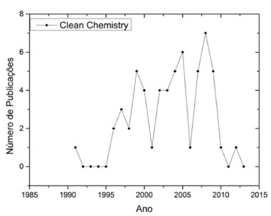 Diferentemente do item anterior, o termo "sustainable chemistry" foi utilizado pioneiramente no ano de 1998. Porém, a palavra-chave também se tornou uma referência em trabalhos de Química Verde apresentando um crescimento marcante nos anos decorrentes. No ano de 2013, existiam cerca de 120 publicações fazendo uso do conceito. C)"Clean chemistry" Na Figura 3 encontra-se um gráfico demonstrando a evolução, ao longo do tempo, do número de publicações fazendo uso da palavra-chave "clean chemistry".