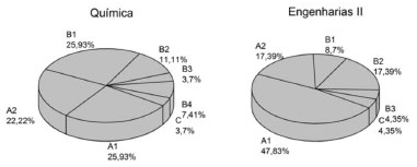 Analisando a Figura 5, percebe-se que, na área de Engenharias II, mais de 50% das revistas apresenta classificação A, enquanto somente 8% apresentam classificação C. No que tange a área da Química, o percentual de revistas A encontra-se abaixo dos 50%, porém ainda assim próximo desse valor. Cerca de 75% dos periódicos, nessa mesma área, estão classificados com os três maiores índices do Qualis (A1,A2,B1). Tais informações mostram que os periódicos relacionados à área de Química Verde são de qualidade reconhecida.