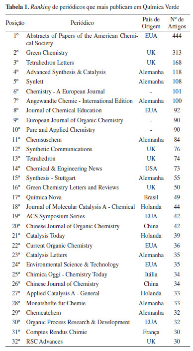 A expressão "clean chemistry" foi trazida à tona pela primeira vez em 1991 com a publicação de um artigo na revista Chemistry & Industry. Entretanto, diferentemente dos termos anteriores, a palavra-chave em questão não teve uma utilização consistente, tendo seu uso oscilado em poucos artigos durante os anos. Em 2013, nenhum artigo fez uso do termo, mostrando que o mesmo não conseguiu se difundir e se firmar como uma possível palavra-chave para os trabalhos de Química Verde. Revistas que mais publicam em Química Verde Uma vez que se observou que o termo "green chemistry" é o mais utilizado como palavra-chave em publicações nessa linha, construiu-se a Tabela 1 que mostra o ranking de periódicos que mais publicam em Química Verde fazendo uso do mesmo.