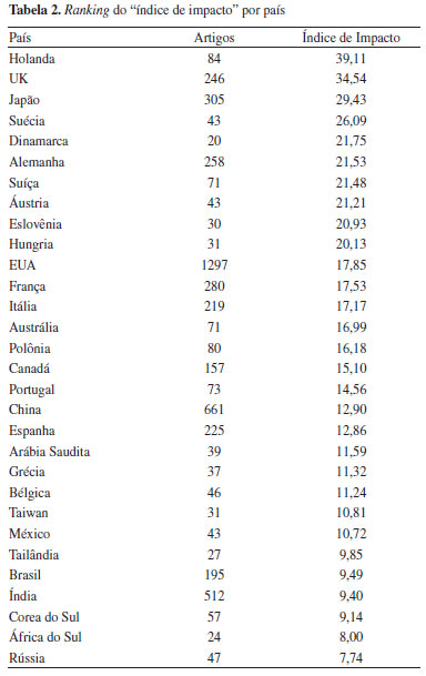 "Índice de impacto" dos países De forma a avaliar a distribuição do número de publicações pelos diferentes países e identificar os maiores difusores de conhecimento na área de química verde, construiu-se a Tabela 2 com o objetivo de medir a participação de cada país na divulgação do conhecimento dessa área. Como métrica para essa participação utilizou-se o que definimos como o "índice de impacto" por país, que consiste na divisão entre o número de citações referentes aos artigos produzidos no país pelo número total de artigos publicados no país. A tabela foi construída com os 30 primeiros países no quesito "índice de impacto".