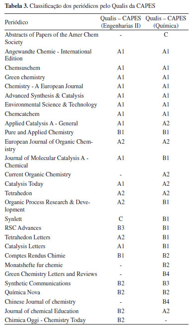 Ao analisar a Tabela 2, pode-se observar que a Holanda lidera com uma média de 39 citações por artigo publicado, seguida do Reino Unido e Japão. Apesar de países como Estados Unidos, China e Índia liderarem o ranking do número de publicações, a tabela mostra que os artigos publicados por esses países não são tão referenciados quando comparados com os de outros países que publicam menos, mas possuem uma média alta de citações por artigo. Como exemplo, a Dinamarca apresenta um número muito baixo de publicações, com apenas 20, mas se destaca com uma média de aproximadamente 22 citações por artigo, o que lhe garante a quarta posição no ranking do "índice de impacto". No caso do Brasil, sua posição não é muito prejudicada quando a classificação é feita por número de publicações, colocando-o em 11º no ranking. Porém, quando o critério utilizado é o "índice de impacto", sua posição cai para 26º. Classificação dos periódicos de acordo com o Qualis da CAPES Dentre os periódicos mais atuantes listados no item anterior, realizou-se uma pesquisa utilizando o Qualis da CAPES12 a fim de avaliar a qualidade das revistas mais importantes na área de Química Verde. A Tabela 3 mostra a classificação das mesmas junto a CAPES.