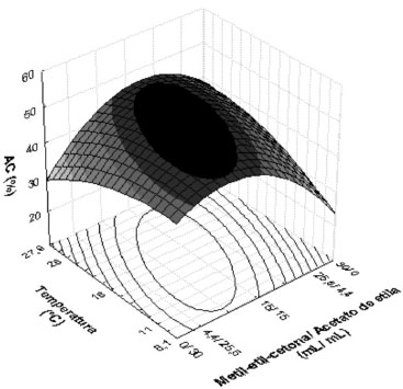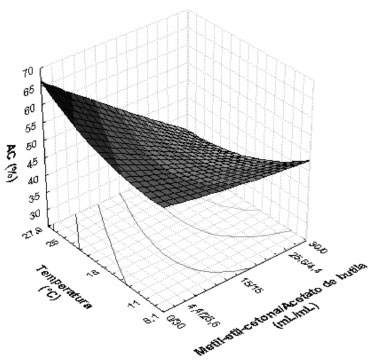 ![]() Figura 3. Superfície de resposta para porcentagem de extraçao de AC (AC%) em funçao da mistura de solventes de Metil-etil-cetona/Acetato de etila (mL/mL) e da Temperatura (°C)