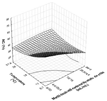 ![]() Figura 4. Superfície de resposta para porcentagem de extraçao de AC (AC%) em funçao da mistura de solventes de Metil-isobutil-cetona/Acetato de etila (mL/mL) e da Temperatura (°C)