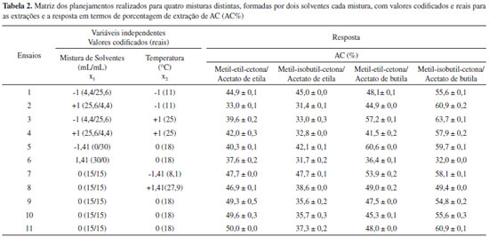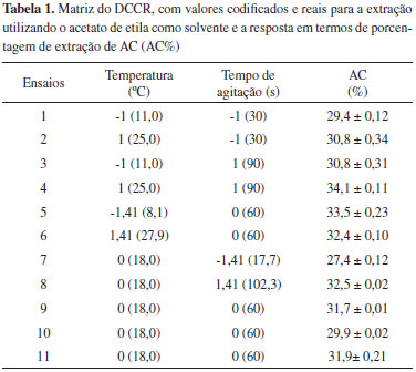 RESULTADOS E DISCUSSAO Resultados obtidos para os planejamentos fatoriais completos O estudo da extraçao com acetato de etila foi realizado no intuito de se obter um maior conhecimento das influências das variáveis envolvidas no processo de extraçao utilizando-se apenas um solvente, para posteriormente se fazer a seleçao das variáveis para os ensaios realizados com misturas de dois solventes. As variáveis tempo de agitaçao (s) e temperatura (ºC), para a extraçao com acetato de etila, foram selecionadas. Por meio dos resultados obtidos (Tabela 1), observou-se que a porcentagem extraída de AC variou de 27,4% (18 ºC e 17,7 s) a 34,1% (25 ºC e 90 s).