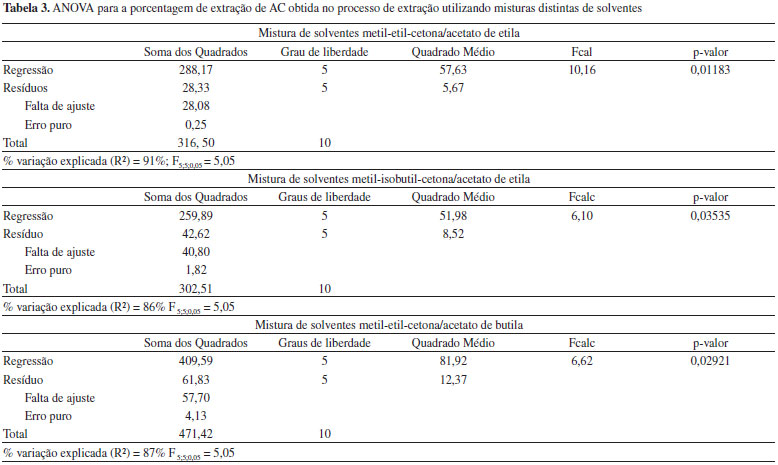 No planejamento em que foi utilizada a mistura dos solventes metil-etil-cetona e acetato de etila observou-se que porcentagem de AC extraída variou de 33,0 a 50,0%. O termo quadrático da mistura de solventes e o termo mistura de solventes x temperatura foram os parâmetros estatisticamente significativos a 5% (p < 0,05). A ANOVA (Tabela 3) apresentou uma boa porcentagem de variaçao explicada (R2) pelo modelo (91%), e o valor de 10,16 para o Fcalc é significativo, ou seja, o modelo se ajusta bem aos dados experimentais sendo possível a construçao da superfície de resposta para a análise dos resultados (Figura 3). O modelo completo com as variáveis codificadas que representa a porcentagem de extraçao de AC obtida em funçao da temperatura e da razao de solventes na faixa estudada está representado pela Equaçao 3. ![]()