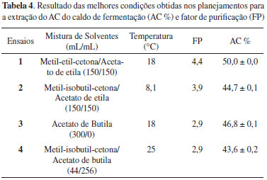 A maior porcentagem de extraçao de AC foi observada no ensaio 5 (60,6%) que corresponde ao nível -1,41 do planejamento, no qual foi utilizado para a extraçao apenas o solvente acetato de butila a 18 ºC. Também para o ensaio 3 foi observado uma boa porcentagem de extraçao de AC (57,2%). Neste ensaio foi utilizado uma mistura de 4,4 mL de metil-etil-cetona e 25,6 mL de acetato de butila a temperatura de 25 ºC. Esse resultado tem grande relevância, considerando que em temperaturas próximas à ambiente, o gasto com energia diminui significativamente. Os resultados obtidos demonstraram ainda que a proporçao da mistura de solventes interferiu na extraçao líquido-líquido, sendo que nas misturas mais ricas em acetato de butila o efeito da temperatura na partiçao se sobrepôs ao efeito de degradaçao do AC. Para o planejamento no qual foi utilizado a mistura dos solventes metil-isobutil-cetona e acetato de butila observou-se que a porcentagem de extraçao de AC variou de 32,0 a 63,7%. Nenhuma das variáveis foi estatisticamente significativa e apesar de nao ter sido feita a análise de superfície, pôde-se obter uma excelente porcentagem de extraçao do AC, visto que o resultado obtido para o ensaio 3 do planejamento (63,7%) foi superior aos encontrados nos demais planejamentos, quando a extraçao foi realizada a temperatura ambiente (25 ºC). Além disso, esses ensaios foram importantes para avaliar a interaçao entre as variáveis, visto que tais interaçoes nao poderiam ser previstas de outra maneira. Sendo assim, pôde-se concluir que a mistura acetato de butila e metil-isobutil-cetona foi considerada a melhor para o processo de extraçao do AC puro a temperatura de 25 ºC. Resultados obtidos para as extraçoes do AC proveniente do caldo de fermentaçao As condiçoes que propiciaram os melhores valores encontrados em cada planejamento, em termos de porcentagem de extraçao de AC, foram aplicadas ao caldo de fermentaçao. Na Tabela 4 estao os resultados obtidos.