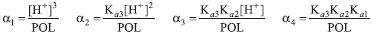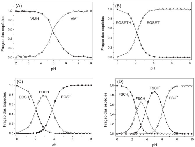 A mesma metodologia foi aplicada para os demais corantes utilizando-se do conhecimento químico e dados da literatura, principalmente quanto ao número de espécies. Na Figura 4 estão apresentadas as frações de cada espécie protolítica dos corantes, em cada pH dentro do intervalo avaliado, calculadas a partir do valor de pKa gerado pela Quimiometria e pelas equações polinomiais. O valor de pKa foi determinado interpolando-se no gráfico o pH no qual há a existência de 50% de cada espécie protolítica.