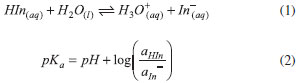 PARTE EXPERIMENTAL Materiais Todos os reagentes utilizados neste trabalho são de grau analítico e foram empregados sem purificação prévia. Utilizaram-se os corantes vermelho de metila (VM: N,N-dimetil-4-aminoazobenzeno, Vetec), etil-eosina (EOSET: 2,4,5,7-tetrabromo-9-[2-(etoxicarbonil)fenil]-3-oxo-3H-xanten-6-olato de potássio, Aldrich), eosina Y (EOS: 2-(2,4,5,7-tetrabromo-6-óxido-3-oxo-3H-xanteno-9-il) benzoato de dissódio, Reagen) e fluoresceína (FSC: 2-(3-hidroxi-6-ceto-xanten-9-il) benzóico, Carlo Erba) cuja pureza foi atestada por cromatografia de camada fina. Os demais compostos utilizados no preparo das soluções foram o cloreto de sódio (Merck), hidróxido de sódio (Merck), ácido clorídrico (Merck), fosfato dissódico (Merck) e ácido cítrico (Aldrich). A água foi destilada. Soluções: pH e força iônica Para controle do pH foi utilizado tampão Mcllvaine ([Na2HPO4] = [Ácido cítrico] = 7,5×10-3 mol L-1) para a faixa de pH entre 2,0 e 8,0 e [NaCl] = 0,10 mol L-1 para controle da força iônica. Para as soluções com pH final inferior a 2,0, o ajuste foi realizado pela adição controlada de microvolumes de solução de ácido clorídrico previamente padronizada. Equipamentos Os valores de pH das soluções foram ajustados em um pHmetro digital MeterLab PHM 240 com eletrodo combinado de vidro. Os espectros eletrônicos de absorção UV-Vis das soluções aquosas dos corantes foram obtidos em um espectrofotômetro Beckman Coulter, modelo DU 800, monitorando dentro da região de 350 a 800 nm. O controle de temperatura para as amostras foi efetuado com sistema Peltier acoplado ao equipamento, mantendo-se a temperatura em 30,0 ºC. Nas medidas, empregaram-se cubetas de poliestireno com caminho óptico de 1,00 cm. Metodologias de obtenção do valor de pKa Diversas soluções aquosas de pH conhecido e na força iônica desejada foram preparadas, das quais transferiu-se 2,0 mL para as cubetas e, em seguida, foi adicionado volume fixo de solução estoque dos corantes, utilizando uma microseringa. A concentração utilizada para as amostras na cubeta para o VM foi 1,25×10-5 mol L-1 e para os demais corantes foi 5,00×10-6 mol L-1, concentrações cujas absorbâncias respeitam a Lei de Lambert-Beer. As soluções aquosas de corante foram previamente padronizadas por UV-Vis utilizando-se as seguintes absortividades molares (ε): VM, MM = 269,30 g mol-1, ε520nm= 23.360 L mol-1 cm-1;38 EOS, MM = 691,99 g mol-1, ε517nm= 96.600 L mol-1 cm-1;39 EOSET, MM = 714,03 g mol-1, ε529nm= 90.000 L mol-1 cm-1;40 FSC, MM = 332,31 g mol-1, ε490nm= 88.000 L mol-1 cm-1.20 Para um equilíbrio ácido-base (Eq. 1), a relação entre as concentrações das espécies protolíticas para cada valor de pH varia de acordo com a equação de Henderson-Hasselbalch (Eq. 2):