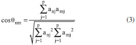 onde anj representa a j-ésima variável do n-ésimo objeto e p o número de variáveis. Dessa forma, todos os demais objetos podem ser considerados combinações lineares dos constituintes principais e assim obtém-se o número de espécies constituintes de um sistema químico e suas concentrações relativas. Entretanto, o resultado obtido pelo método Q de Imbrie diretamente não fornece um conjunto de composições distintas e, por isso, nem sempre pode ser facilmente interpretado. Por isso, aplicam-se as rotações varimax e a projeção oblíqua de Imbrie.46,47