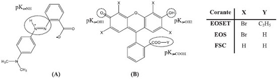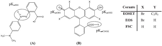 Figura 1. Estruturas dos corantes: (A) vermelho de metila (VM) e (B) Xantenos: etil-eosina (EOSET), eosina (EOS) e fluoresceína (FSC). Destacam-se os grupos que sofrem protonaçao/desprotonaçao, sendo que os termos a frente da abreviatura pKa sao indicativos dos correspondentes grupos envolvidos