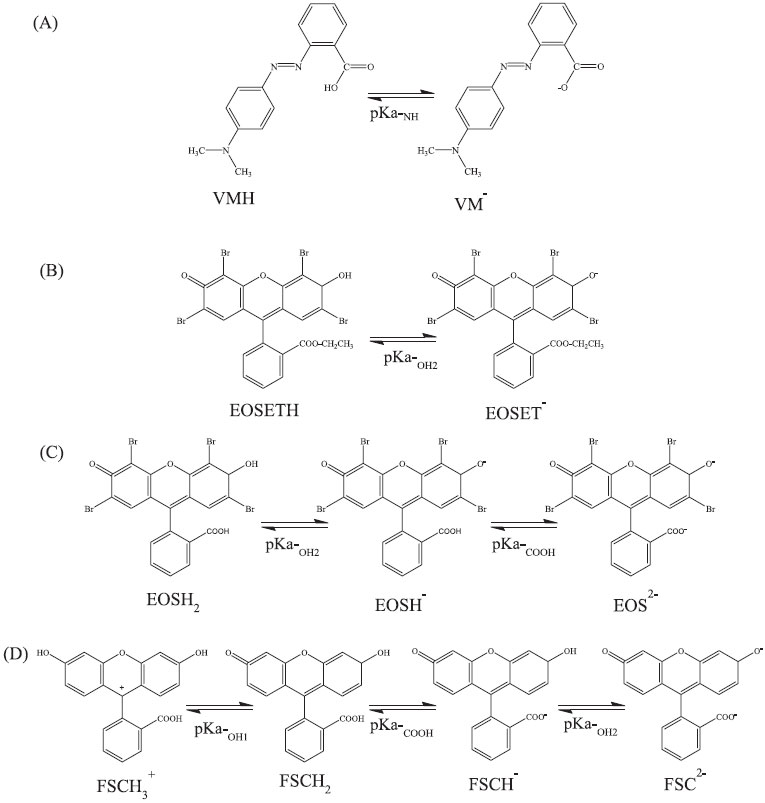 Conforme observado na Figura 1B, os corantes xantênicos possuem dois grupos fenólicos em sua estrutura além de um grupo carboxílico, exceto para EOSET onde o pKa-COOH não existe em função da existência da ligação éster. Porém, no caso da EOS e EOSET o pKa do equilíbrio entre as formas catiônica e neutra é de aproximadamente -2,0 em água (escala de Hammet) devido aos átomos de bromo na estrutura xantênica que aumenta a acidez do composto.50 Essa região muito ácida não é abordada no presente trabalho. As espécies protolíticas propostas na literatura em meio aquoso para VM, EOSET, EOS e FSC estão mostradas na Figura 2. Ressalta-se que estão sendo considerados apenas os equilíbrios protolíticos existentes dentro da faixa de pH investigada. Ou seja, para o VM e EOSET há apenas duas espécies em equilíbrio, portanto apenas um pKa; já para a EOS o sistema é mais complexo, com três espécies em equilíbrio, e portanto dois valores de pKa. E, por fim, para a FSC há quatro espécies em equilíbrio e três valores de pKa. Por questões didáticas, os resultados serão exibidos por metodologia aplicada, iniciando pelo método convencional e finalizando com a análise multivariada proporcionada pela Quimiometria.