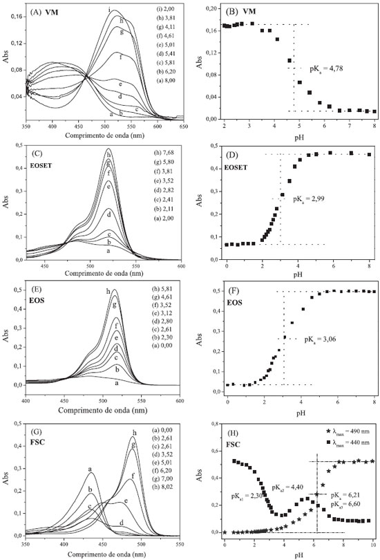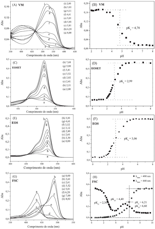 Figura 3. Espectros de absorçao em diferentes pH em meio aquoso e variaçao de absorbância no λanal: (A) e (B) VM; (C) e (D) EOSET; (E) e (F) EOS; (G) e (H) FSC