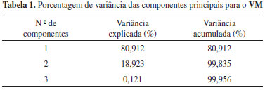 A partir dos dados espectrofotométricos do VM construiu-se o gráfico de intensidade de absorção junto a 530 nm em função do pH (Figura 3B). A curva resultante teve a forma sigmoidal característica e o ponto de inflexão forneceu o valor de pKa. A EOSET, igualmente com um equilíbrio, tem em baixos valores de pH - espécie neutra, as bandas de absorção pouco intensas, sem definição (Figura 3C) e a solução é quase incolor.50 Com o aumento do pH há a formação da espécie monoaniônica e o aparecimento da banda em 520 nm, exibindo uma coloração rosa. Embora se perceba a existência de um ponto isosbéstico, trata-se de um sistema ligeiramente mais complexo do que o VM, pois como pode ser observado as bandas das espécies protonada e desprotonada estão sobrepostas. Novamente o ponto de inflexão, obtido a partir da curva de absorbância (520 nm) versus o pH, indica o valor de pKa para a EOSET (Figura 3D). Para a EOS observam-se duas bandas (Figura 3E), sendo a mais intensa com máximo em 517 nm em meio básico (coloração rosa) e a outra com λmáx na região de 480 nm em meio ácido, mais alargada e com menor intensidade (quase incolor). Apesar de possuir uma espécie protolítica a mais (estrutura na Figura 2C), o perfil espectral apresentado pela EOS (Figura 3E) foi o mesmo obtido para a EOSET (Figura 3C), uma vez que o grupo cromofórico de ambas é idêntico, isto é, o anel xantênico. O formato monosigmoidal da curva de absorbância contra pH da EOS, na Figura 3F, sugere erroneamente a existência de somente um grupo protolítico, o que resultaria em um único pKa. A existência de mais de um grupo ácido-base com proximidade entre os pKa aliado à intensa sobreposição de bandas prejudica a determinação e diferenciação dos mesmos. Assim, é evidente que o método univariado em sistemas complexos resulta em interpretação equivocada, consequentemente levando a erros. Por fim, a FSC foi o corante utilizado de maior complexidade, uma vez que possui quatro espécies protolíticas (três pKa, Figura 2D) e elevada sobreposição espectral como mostrado na Figura 3G. Nestes espectros notam-se duas bandas distintas, uma em 435 nm predominante em meios ácidos (pH < 3) e outra em 490 nm em meios básicos (pH > 8). Para valores de pH intermediários não há uma nítida definição das bandas, devido à intensa sobreposição. Porém, seguindo-se a recomendação de monitorar a variação de intensidade junto à banda de máxima absorção,41 λmáx = 490 nm, o perfil obtido foi próximo ao de monoexponencial (Figura 3H), resultando em um único valor de pKa quando na verdade são esperados três como já citado.52 Dada essa incoerência, analisou-se a variação de absorbância em diversos outros comprimentos de onda. Tomando-se 440 nm como λanal visualiza-se três pKa (Figura 3H), sendo pKa1 = 2,30; pKa2 = 4,40; e pKa3 = 6,38. Nesse caso, é evidente que a escolha do comprimento de onda analítico foi fundamental. Assim, em sistemas protolíticos complexos pode-se obter resultados coerentes com a utilização de metodologias univariadas, desde que se faça uma varredura de diversos comprimentos de onda à procura de um λanal que reflita todos os equilíbrios protolíticos, o que não é usual e é de difícil execução, podendo ainda levar a equívocos. Como verificado, de forma geral, a aplicação de análise univariada para corantes que apresentem dois ou mais pKa aliada a uma intensa sobreposição espectral não é confiável, como é o caso da EOS e FSC. Propositalmente, a comparação dos valores obtidos com os existentes na literatura é discutida mais adiante em conjunto com aqueles resultantes do método quimiométrico. Método quimiométrico de determinação de pKa Para o VM, dentro da faixa de pH investigada tem-se duas formas protolíticas, como previamente apresentado (Figura 2A). Na Análise das Componentes Principais (ACP) verificou-se que duas variáveis (que corresponde ao envolvimento de duas espécies) explicam 99,835% da variância contida nos dados, conforme listado na Tabela 1. Desta forma, o sistema na totalidade reúne informações de acordo com a existência de apenas duas espécies protolíticas, sendo que a quantidade de informações descritas pela terceira é somente 0,121%. Assim, a partir das evidências químicas do conhecimento estrutural do corante e de ter-se a contribuição da terceira variável muito pequena, a existência desta terceira espécie protolítica é desconsiderada.