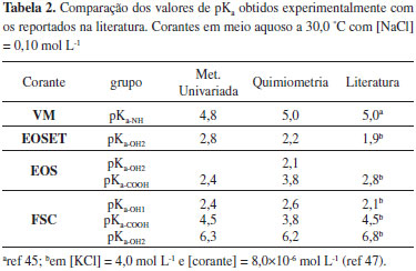 Comparação de valores de pKa determinados pelas metodologias convencional e quimiométrica com os valores da literatura Os valores de pKa determinados a partir da metodologia quimiométrica para os corantes estudados encontram-se na Tabela 2, juntamente com aqueles determinados pelo método univariado - convencional, bem como os valores descritos na literatura.