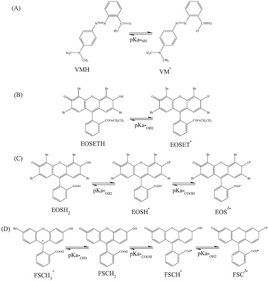 Figura 2. Equilíbrios ácido-base dos corantes estudados: (A) Vermelho de metila,45 (B) Etil-eosina,46 (C) Eosina46 e (D) Fluoresceína46
