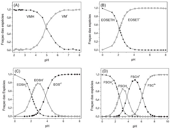 Figura 4. Fraçoes das espécies protolíticas dos corantes em diversos pH: (A) VM, (B) EOSET, (C) EOS e (D) FSC