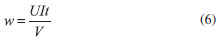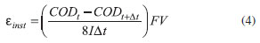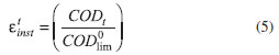 where COD0lim is the initial COD limiting value calculated by eq. 3. The low εinst values obtained in the absence of chloride ions are due to the higher applied current density with respect to the limiting one. Thus, a large amount of the supplied charge was lost to the parasitic O2 evolution reaction. These results demonstrate the significant contribution of indirect oxidation to improve the efficiency of the electrooxidation process under mass-transfer limitation. Moreover, it is important to highlight that the εinst values were quite similar for both anodes, a characteristic also previously described for the COD removal. The decrease of the εinst values in the final stages of the electrooxidation may be because of increased O2 evolution reaction that occurred because the organic load was being completely oxidized. The electric energy consumption per unit volume of electrolyzed dye solution (w) was obtained according to
