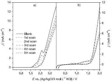 ![]() Figure 1. Linear polarization measurements (20 mV s−1) using a (a) Nb/BDD or (b) Ti-Pt/β-PbO2 anode in the absence (blank: 0.1 mol L−1 Na2SO4) and presence of 100 mg L−1 DB 22 dye in 0.1 mol L−1 Na2SO4, at 25 ºC. Previously, the anodes were pretreated for 15 min in a 0.1 mol L−1 Na2SO4 solution by applying 6 mA cm−2