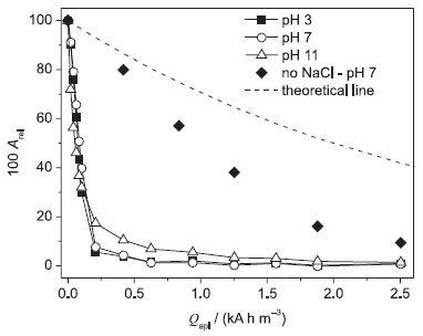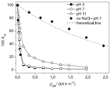 ![]() Figure 2. Relative absorbance (Arel) as a function of the applied charge per unit volume of electrolyzed solution (Qapl) for the electrooxidation of 100 mg L−1 DB 22 dye solutions (in 0.1 mol L−1 Na2SO4 + 1.50 g L−1 NaCl) of distinct pH values (indicated in the figure) using the Nb/BDD anode in a filter-press flow reactor at 25 ºC. Theoretical line (- - -) (see text). Electrolysis conditions: j = 30 mA cm−2; qV = 7.0 L min−1; V = 0.4 L