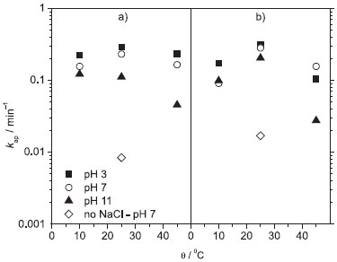 ![]() Figure 4. Apparent first-order kinetic constants (kap) as a function of solution temperature for the electrooxidative decolorization of 100 mg L−1 DB 22 dye solutions (in 0.1 mol L−1 Na2SO4 + 1.50 g L−1 NaCl) of distinct pH values (indicated in the figure) using the (a) Nb/BDD or (b) Ti-Pt/β-PbO2 anode in a filter-press flow reactor. Electrolysis conditions: j = 30 mA cm−2; qV = 7.0 L min−1; V = 0.4 L