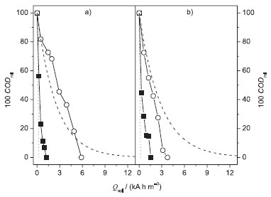 ![]() Figure 5. Relative COD removal (100 CODrel) as a function of the applied charge per unit volume of electrolyzed solution (Qapl) for the electrooxidation of 100 mg L−1 DB 22 dye solutions (in 0.1 mol L−1 Na2SO4) at pH 7 and 25 ºC, in the presence (■ - 1.5 g L−1) or absence of NaCl (○), using the (a)BDD or (b) Ti-Pt/β-PbO2 anode in a filter-press flow reactor. Theoretical line (- - -) (see text); 100 % COD efficiency line (). Electrolysis conditions: j = 30 mA cm−2; qV = 7.0 L min−1; V = 0.4 L