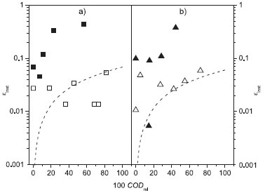 ![]() Figure 6. Instantaneous current efficiency (εinst) as a function of the relative COD for the electrooxidation of 100 mg L−1 DB 22 dye solutions (in 0.1 mol L−1 Na2SO4) at pH 7 and 25 ºC, in the absence (empty symbols) and presence (full symbols) of 1.5 g L−1 NaCl, using the (a) BDD or (b) Ti-Pt/β-PbO2 anode in a filter-press flow reactor. Theoretical line (- - -) (see text). Electrolysis conditions: j = 30 mA cm−2; qV = 7.0 L min−1; V = 0.4 L