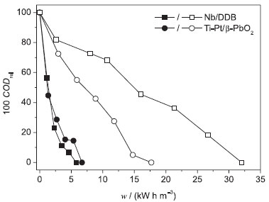where U is the cell potential (V). Figure 7 shows the relative COD decay as a function of the obtained w values at pH 7 and 25 ºC, in the presence and absence of chloride ions, using the BDD and β-PbO2 anodes. The w values in the presence of chloride ions were much lower than those in their absence, due to the mediated oxidation promoted by chloro oxidant species; however, it is important to emphasize that when electrolysis occurred in the presence of chloride ions, the possible chlorination of the organic compounds might lead to erroneous COD values, as previously discussed. Thus, it is likely that the true w values required for the complete oxidation of such a large model compound are better represented by those attained in the absence of chloride ions. In a recent work, Aquino et al.11 showed that the COD removal values attained during the electrooxidation of synthetic dyes in the presence of chloride ions using a Si/BDD anode did not lead to complete conversion into CO2, as the total organic carbon content was not completely removed. On the other hand, in the absence of chloride ions, the COD assays could be used as an indicator of the dye conversion into CO2.