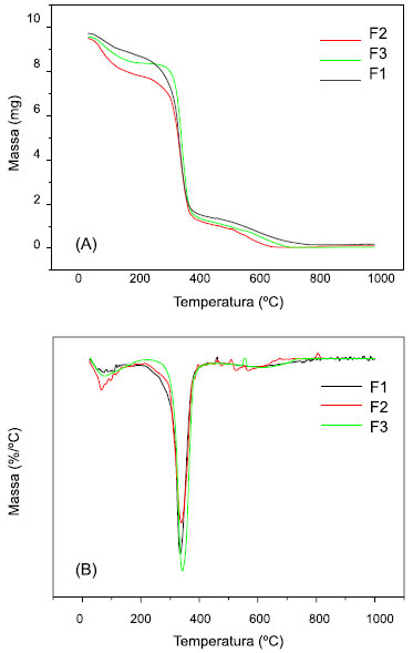 ![]() Figura 2. Curvas de TGA (A) e sua derivada DTG (B) das formulaçoes F1, F2 e F3