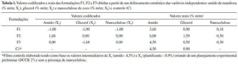 PARTE EXPERIMENTAL Material Como materiais foram utilizados o amido de mandioca (Cargill Agrícola SA), Glicerol (Synth®), fibra de coco verde obtida em feiras livres (Salvador - Bahia - Brasil), reagentes como hidróxido de sódio, hipoclorito de sódio, ácido sulfúrico (98,08%) e ácido acético Vetec® e Membrana de celulose para diálise D9777 - 100 FTO (cut-off 12.000 Da), da Sigma-Aldrich. Extraçao da celulose da fibra de coco verde As fibras de coco verde foram secas em estufa (100 ºC) e posteriormente trituradas em liquidificador para obtençao de um fino particulado e peneirado em peneira de malha 40. Em seguida 30 g da amostra foram lavados com 1200 mL de soluçao de NaOH a 2%, durante 4 horas sob agitaçao constante (80 ºC). A soluçao resultante foi filtrada a vácuo utilizando funil de Büchner e Kitassato e lavada com água destilada para a obtençao da polpa. O processo de lavagem e filtraçao foi repetido por quatro vezes para a remoçao completa dos agentes solúveis em água. Após a lavagem das fibras, foi realizado o processo de deslignificaçao da polpa, por meio do branqueamento utilizando uma mistura de 300 mL de hipoclorito de sódio 1,7% e 300 mL de soluçao tampao. A soluçao resultante foi colocada sob agitaçao (80 ºC) por 6 horas, filtrada e seca em estufa (40 ºC), obtendo-se assim o resíduo ou polpa de celulose, que posteriormente foi pulverizado em moinho. A metodologia utilizada foi adaptada de Rosa et al.17 e Samir et al.28 Obtençao na nanocelulose da fibra de coco verde Os nanocristais de celulose foram preparados por hidrólise ácida utilizando H2SO4 64%, conforme metodologia adaptada de Rosa et al.17 Um total de 12 mL g-1 de celulose foi submetido à agitaçao constante durante 10 a 15 minutos, a 50 ºC. Após o tratamento de hidrólise ácida, as amostras foram filtradas, avolumadas com água destilada em tubos Falcon de 40 mL e centrifugadas durante 10 min a 4400 rpm a 10 ºC com o objetivo de separar os cristais da suspensao. Este procedimento foi repetido até nao apresentar mais sobrenadante (média de 6 a 7 vezes). Em seguida, as suspensoes foram submetidas à diálise utilizando membranas de celulose, e após atingir o pH entre 6 a 7 as amostras foram colocadas em banho de ultrassom por 5 minutos para a dispersao dos nanocristais. Microscopia eletrônica de transmissao (TEM) A suspensao de nanocelulose de fibra de coco foi analisada por TEM a fim de determinar o comprimento das fibras (L), diâmetro (D) e para indicar o estado de agregaçao dos cristais. A suspensao de nanocelulose foi misturada em volumes iguais com acetato de uranila aquosa a 2% (UA) e 10 mL da mistura UA-nanocelulose foram dispensados em uma grade de cobre (400 mesh) e deixada em repouso durante 30-60 segundos. A grade foi seca e visualizada em microscópio eletrônico de transmissao FEI Tecnai G2-Spirit com 120 kV de voltagem de aceleraçao. Os comprimentos e diâmetros dos cristais foram medidos diretamente das micrografias eletrônicas de transmissao usando Image Tool 6.3 (Media Cybernetics, Inc., Bethesda, MD) realizando-se 30 mediçoes para determinar os valores médios e desvios padrao. Desenvolvimento dos nanobiocompósitos por casting Os nanobiocompósitos foram processados segundo a técnica de casting, que consistiu na preparaçao de uma soluçao filmogênica, dissolvendo-se amido de mandioca em água destilada (3,6; 4,5; e 6,0%, g/100 g), utilizado glicerol como agente plastificante (0,5; 0,9; 1,5%, g/100 g) e suspensao de nanocelulose (0,18 e 0,30%, g/100 g), que posteriormente foi aquecida até a temperatura de gelatinizaçao do amido (70 ºC), sob constante agitaçao manual. A soluçao filmogênica (40 g) foi pesada em Placas de Petri de poliestireno e desidratada em estufa com circulaçao de ar (35 ± 2 ºC) por 18 a 20 horas. Os nanobiocompósitos obtidos foram acondicionados (60% UR, 23 ºC) em dessecadores contendo soluçao saturada de cloreto de sódio, por 10 dias, antes de serem caracterizados, conforme adaptaçao da metodologia proposta por Veiga-Santos e Scamparini.29 As 3 formulaçoes preparadas (F1, F2 e F3) foram obtidas a partir de um estudo preliminar27 realizado a partir de um planejamento composto central rotacional (DCCR 23) (Tabela 1), que culminou com a obtençao de 17 formulaçoes. As 3 formulaçoes estudadas foram selecionadas tendo em vista as ótimas propriedades mecânicas apresentadas. Para cada formulaçao estudada, os resultados identificados foram comparados com um filme controle (C1 - 4,5% de amido e 0,9% de glicerol, g/100 g) sem a adiçao de nanocelulose para análise comparativa das propriedades de barreira e mecânicas. O controle foi elaborado com base nos valores intermediários de amido (X1) e glicerol (X2) obtido no delineamento.