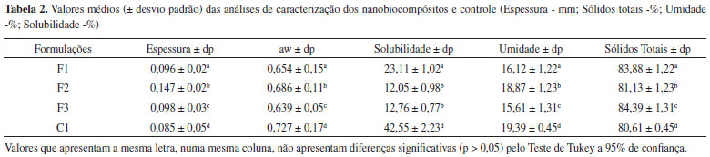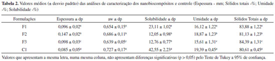 Destaca-se que as condiçoes de hidrólise utilizadas para a preparaçao dos nanocristais sao responsáveis pelas propriedades dimensionais dessas partículas,36,38 pois o ataque ácido prolongado pode nao apenas destruir as partes amorfas da celulose, mas também destruir as zonas parcialmente cristalinas das fibras, resultando portanto em uma reduçao do comprimento dos nanocristais. Mesquita et al.,36 por meio das imagens de TEM, obtiveram valores médios de comprimento (L) e largura (D) da nanocelulose de eucalipto de 145 ± 25 nm e 6,0 ± 1,5 nm, respectivamente, dando uma proporçao de aspecto (L/D) de cerca de 24. Os resultados encontrados neste estudo também sao consistentes com os encontrados por outros autores que caracterizaram as dimensoes da nanocelulose obtidos de diferentes fontes.11,38-40 As três formulaçoes de nanobiocompósitos obtidas a partir de um planejamento composto central rotacional (DCCR 23) preliminar27 e filme controle (C1) foram investigados quanto às propridades de barreira (espessura, aw, solubilidade em água e umidade), propriedades mecânicas (tensao máxima, módulo de Young e percentual de deformaçao) e a biodegradabilidade em solo preparado (formulaçoes e controle C2). Buscou-se avaliar a influência da adiçao da soluçao de nanocelulose da fibra de coco sobre estes parâmetros. Foram também avaliadas as propriedades térmicas dos nanobiocompósitos preparados através das análises de TGA e DSC. As variaçoes nos teores de sólidos totais foram significativas entre as diferentes formulaçoes dos nanobiocompósitos, e entre as formulaçoes e o controle (C1) (p < 0,05), com limites de 80,61% (C1) e 84,39% (F3), conforme demostrado na Tabela 2. Os valores de espessura dos filmes variaram de 0,096 mm para a formulaçao F1 (3,6% de amido) a 0,147 mm para a formulaçao F2 (6,0% de amido). Apesar dos nanobiocompósitos terem sido elaborados a partir de valores pré-estabelecidos (40 g de massa de soluçao filmogênica), foram constatadas diferenças significativas (p < 0,05) entre as formulaçoes de nanobiocompósitos (Tabela 2). Observa-se que as formulaçoes com os maiores perecentuais de amido apresentam os maiores valores de espessura. Para filmes formulados com a mesma matriz e adiçao de diferentes concentraçoes de polpa de manga e acerola,23 cacau e extrato de café,41 e com nanocelulose de coco com extrato de erva-mate,13 as espessuras variaram de 0,123 a 0,141 mm, de 0,113 a 0,143 mm e de 0,100 a 0,150 mm, respectivamente, com diferenças significativas entre as formulaçoes (p > 0,05).