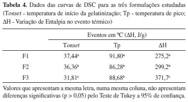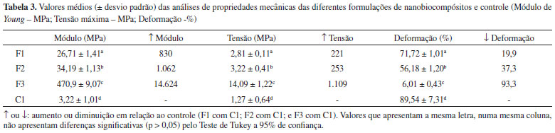 Determinaçao da espessura e propriedades mecânicas A espessura dos nanobiocompósitos e controle pré-acondicionados (60% UR, 25 ºC) foi avaliada por meio da espessura média, de 6 mediçoes em posiçoes aleatórias, por meio de micrômetro digital Mitutoyo de ponta plana (com resoluçao de 1 µm), em triplicata. Os ensaios de traçao foram realizados em uma máquina universal de ensaios EMIC, modelo DL2000/700, com carga máxima de 20 KN, seguindo a norma ASTM D-882,30 com velocidade de 12,5 mm min-1 e temperatura de 25 ºC, nos quais foram determinados a tensao máxima, módulo de Young (elasticidade) e percentual de deformaçao. Foram realizados ensaios de traçao em 8 corpos de prova para cada amostra, com dimensoes de 50 mm de comprimento e 25 mm de largura. As propriedades mecânicas dos nanobiocompósitos foram monitoradas ao logo de 90 dias para avaliar a estabilidade dos nanocristais como aditivo de reforço. As formulaçoes ficaram acondicionadas em dessecadores contendo soluçao saturada de cloreto de sódio (60% UR, 23 ºC) e avaliadas nos dias 0, 30, 60 e 90. Determinaçao da atividade de água (aw), solubilidade, umidade e sólidos totais As mediçoes de aw dos nanobiocompósitos e controle foram realizadas com um decágono, LabMaster (Novasina), com controle de temperatura (25 ºC) utilizando o Software Novalog MC. A umidade e sólidos totais dos filmes foram obtidos por secagem no infravermelho, em equipamento Balança Infravermelho Shimadzu, com intensidade da radiaçao emitida de modo que a amostra atingisse 110 ºC. A solubilidade em água das formulaçoes e controle foi determinada de acordo com Gontard et al.31 Todas as determinaçoes foram realizadas em triplicata. Análise termogravimétrica (TGA) e de calorimetria exploratória diferencial (DSC) As análises termogravimétricas dos nanobiocompósitos foram realizadas em um analisador térmico DTG-60 Shimadzu. Nos ensaios foram usadas massas de aproximadamente 8 mg, cadinho de platina, atmosfera inerte de nitrogênio de 30 mL min-1, com taxa de aquecimento de 10 ºC min-1, no intervalo de temperatura de 25 a 600 ºC. Os resultados foram expressos por meio das curvas de TGA e pela sobreposiçao da curva de DTG (Derivative Thermogravimetry), derivada da primeira curva. Para a análise de Calorimetria Exploratória Diferencial (DSC) foi utilizado um instrumento universal Perkin Elmer, modelo DSC 7. Cerca de 8-10 mg de amostras pré-condicionadas (60% UR, 25 ºC) foram hermeticamente seladas em cadinhos de alumínio, para prevenir a evaporaçao da água durante a varredura. Um cadinho de alumínio vazio serviu como referência. A varredura foi realizada, nas temperaturas de -50 ºC a 250 ºC, com uma taxa de 10 ºC min-1 e 10 mm de N2 min-1. As amostras foram avaliadas conforme metodologia proposta por Sobral.32 Foram calculadas a Tonset (menor temperatura do evento de gelatinizaçao), Tp (Temperatura de pico da gelatinizaçao) e a ΔH (variaçao de entalpia no evento de gelatinizaçao) a partir do termograma gerado na varredura. Avaliaçao da biodegradabilidade A avaliaçao da biodegradabilidade dos nanobiocompósitos e de uma amostra sem a presença de nanocelulose (C2 - 4,5% de amido e 1,5% de glicerol) foi realizada de acordo com Leite et al..33 O solo simulado utilizado foi preparado misturando-se partes iguais de solo fértil com baixo teor de argila e areia de praia seca e peneirada (40 mesh), e esterco de cavalo seco ao sol por dois dias, seguindo a norma ASTM G-160-03.34 Os filmes foram acondicionados em sistemas diferentes para serem retirados após 2, 4, 12, 15 e 17 semanas, sendo que cada sistema continha uma amostra de cada formulaçao (F1, F2, F3) e do controle C2. O sistema foi formado por Placas de Petri, nas quais foram adicionados o solo preparado e as amostras. As placas contendo os filmes foram colocadas em estufa (cultura bacteriológica com circulaçao de ar) e mantida a 30 ºC (± 2 ºC), e os sistemas foram retirados após o período estipulado, quando foram limpos e pesados. Análise estatística Os resultados determinados no trabalho foram tratados pelo Teste de Tukey para identificar a existência de diferenças significativas entre as formulaçoes, e formulaçoes e controle, com nível de significância de 95%, para cada parâmetro avaliado.