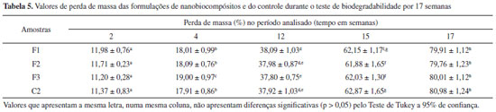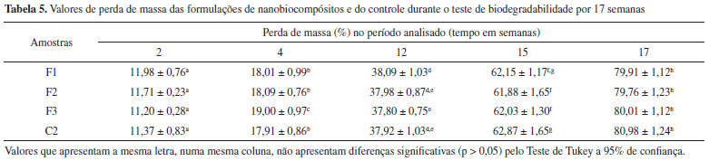 Os valores de Tp para a gelatinizaçao, sem a presença de glicerol para diferentes tipos de amido, tipicamente situam-se entre 65-75 ºC. No entanto, esses valores aumentam significativamente quando da adiçao de um plastificante com maior massa molar, comparado com a água, como é o caso do glicerol.59 Foi proposto que esse efeito (de aumento da temperatura de gelatinizaçao com a quantidade de glicerol) ocorre pois a natureza hidrofílica do glicerol interfere na absorçao de umidade do amido e, consequentemente, diminui a umidade efetiva do amido, disponível para ajudar na gelatinizaçao.56,59 Observa-se, de fato, que a Tp foi menor para os nanobiocompósitos que apresentaram menor concentraçao de glicerol. A Tonset variou de 31,81 a 37,44 ºC, enquanto que a Tp teve uma variaçao de 86,28 a 91,80 ºC. A formulaçao F3 foi a que apresentou a menor Tonset (31,81 ºC) (Tabela 4), podendo isso estar relacionado ao menor conteúdo de glicerol presente nessa formulaçao, quando comparada com as demais. A energia necessária para a desorganizaçao da ordem molecular difere de acordo com a formulaçao do filme, sendo maior na formulaçao F3, ΔH = 371,7 J g-1, que apresenta valores intermediários de amido, menor percentual de plastificante e maior valor de nanocelulose incorporados, e menor para formulaçao F1, ΔH = 275,2 J g-1, que apresenta as menores concentraçoes de plastificante e de nanocelulose. O processo de biodegradaçao neste estudo foi acompanhado por 17 semanas, em solo preparado a 30 ºC, conforme as normas da ASTM G 160-0334 (Tabela 5). A viabilidade do solo preparado foi testada conforme a Norma NBR 11912.60 O resultado do teste de viabilidade do solo preparado foi satisfatório, pois ocorreu a perda de 85% da resistência mecânica da lona de algodao crua.