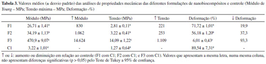 Um dos parâmetros mais importantes utilizados para a conservaçao de alimentos é o controle da atividade de água (aw). A aw é considerada como um parâmetro inteiramente ligado à umidade do alimento, o que permite determinar sua capacidade de conservaçao, de propagaçao microbiana e de acontecimento de reaçoes químicas.42 A reduçao da quantidade de água livre em embalagens para produtos alimentícios tem como consequência a minimizaçao da disponibilidade de água para o crescimento de microorganismos, evitando assim alteraçoes químicas indesejáveis para o armazenamento dos produtos.43 Destaca-se, ainda, que produtos que possuem valores de aw inferiores a 0,600 sao relativamente protegidos contra a contaminaçao microbiana, enquanto que a proliferaçao de microorganismos específicos pode ocorrer com valores de aw superiores a 0,600.43 Considerando-se que a água migra de áreas com altos valores de aw para áreas de baixos valores de aw, é importante ter valores baixos para este parâmetro quando se usa embalagens para produtos alimentares, tais como películas de base biológica.11,13,22,44 Comparando os nanocompósitos desenvolvidos com o filme controle, pode-se observar que a adiçao dos nanocristais de celulose da fibra de coco diminui os valores de aw (p < 0,05) (Tabela 2). Os valores de aw variaram de 0,638 a 0,686 e os de umidade de 81,13 a 84,39% entre as formulaçoes, sendo assim considerados como produtos de umidade intermediária. Silva et al.12 formularam e caracterizaram filmes de amido contendo nanocelulose de eucalipto e encontraram valores de aw que variaram de 0,461 a 0,630, e constataram que as formulaçoes contendo maiores percentuais de nanocelulose possuíam menores aw. A solubilidade dos filmes em água é uma importante propriedade, podendo atuar como proteçao para alimentos em que a aw é alta, quando o alimento tem contato com a água durante a cocçao31 ou mesmo quando os filmes sao ingeridos (comestíveis).45 Todos os nanobiocompósitos estudados depois de ficarem imersos em água por 24 horas sob constante agitaçao, apresentaram-se inteiros e aparentemente íntegros quanto à forma, e ainda permaneceram com boa flexibilidade e dobráveis durante ao manuseio. No aspecto visual, os filmes perderam a transparência e apresentaram-se opacos. Resultados semelhantes ao deste estudo foram encontrados por Matta et al..45 As maiores solubilidades foram encontradas para a amostra controle, seguida da formulaçao F1, 42,55 e 23,11%, respectivamente. Os nanobiocompósitos F2 e F3, com as mesmas concentraçoes de nanocelulose incorporada (0,30%), apresentaram solubilidade em água de 12,05 e 12,76%, respectivamente, sem diferenças significativas entre as amostras (p > 0,05), indicando assim que a presença dos nanocristais em maior concentraçao diminui a solubilidade dos biopolímeros em água.11 Os nanocristais de celulose podem proporcionar uma barreira física por meio da interaçao com a matriz polimérica de amido e com o plastificante, dificultando, portanto, a permeaçao de água, observando-se como consequência a reduçao de sua absorçao. Como a interaçao da matriz de amido com moléculas de água sao dificultadas, observa-se, portanto, uma diminuiçao da solubilidade em água dos nanobiocompósitos quando comparada com o controle. O comportamento dos nanocristais de celulose como uma barreira física à penetraçao de água pode ser explicado pelo elevado grau de cristalinidade dessas nanopartículas (índice de cristalinidade de 69,1%). Resultados semelhantes ao deste estudo foram encontrados por Rodriguez et al.,46 Paralikara et al.47 e Saxena e Ragauskas.48 Destaca-se ainda que a adiçao de plastificante, em particular o glicerol, tem grande influência sobre a solubilidade de filmes de amido, devido ao seu caráter hidrofílico. O glicerol interage com a matriz do filme aumentando o espaço livre entre as cadeias, facilitando a entrada da água e, consequentemente, aumentado a solubilidade.49-51 A incorporaçao da soluçao de nanocelulose de coco aos filmes biodegradáveis de amido plastificados com glicerol, em diferentes concentraçoes, resultou em alteraçao das propriedades mecânicas das formulaçoes estudadas (Tabela 3). Os nanocristais de celulose foram eficazes para aumentar a tensao máxima em até 1.109% (F3) quando se compara com o controle (filme de amido sem nanocelulose - C1). Destaca-se que esta propriedade foi significativamente alterada (p < 0,05) com a incorporaçao de nanocelulose em todas as concentraçoes estudadas. Na Tabela 3 sao apresentados os resultados para a determinaçao das propriedades mecânicas dos nanobiocompósitos em comparaçao com o controle estudado, evidenciando o aumento do módulo e tensao máxima e, consequentemente, a diminuiçao do percentual de deformaçao.