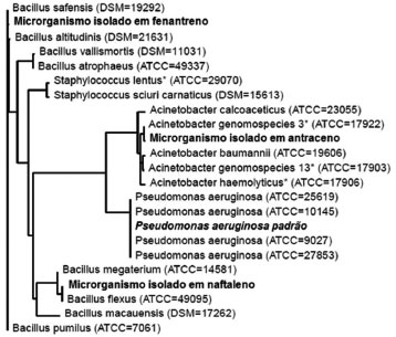 RESULTADOS E DISCUSSAO Identificaçao das bactérias isoladas Três microrganismos foram isolados a partir de lodo biológico coletado na estaçao de tratamento de efluentes de refinaria de petróleo por meio da técnica de enriquecimento usando antraceno, fenantreno ou naftaleno como única fonte de carbono e energia. Após a extraçao e amplificaçao parcial do gene 16S rDNA, as sequências foram reunidas e editadas usando o programa MicroSeq v.1.0 para a identificaçao dos isolados. Os resultados mostram que a sequência de 16S rDNA do isolado em antraceno apresentou alta homologia com a espécie Acinetobacter genomospecies 3 ATCC 17922 (99,97%), enquanto os isolados em fenantreno e naftaleno apresentaram 99,99% e 100% de similaridade com Bacillus pumilus ATCC 7061 e Bacillus flexus ATCC 49095, respectivamente. Com base nas sequências parciais do 16S rDNA foi construída a árvore filogenética (Figura 1).