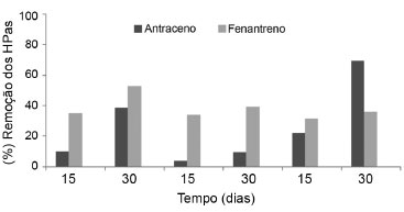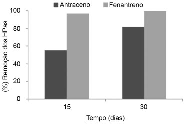 ![]() Figura 4. Biodegradaçao dos HPAs pelo consórcio microbiano em meio mineral contendo a mistura dos três HPAs. A. genomospecies 3, B. pumilus e B.flexus foram cultivados em meio mineral contendo 250 mg L-1 de antraceno ou fenantreno. HPA residual foi determinado após 15 e 30 dias por CG-DIC. Percentagem de remoçao foi calculada considerando a quantidade do composto perdido por evaporaçao. Os HPAs foram estimados utilizando uma curva de calibraçao construída para cada HPA com coeficiente de determinaçao (r2) de 0,9979 e 0,9985 para o antraceno e fenantreno, respectivamente