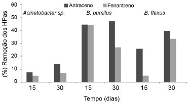 ![]() Figura 2. Biodegradaçao dos HPAs por cada isolado em meio mineral contendo apenas um tipo de HPA. A. genomospecies 3, B. pumilus e B. flexus foram cultivados em meio mineral contendo 250 mg L-1 de antraceno ou fenantreno. HPA residual foi determinado após 15 e 30 dias por CG-DIC. Percentagem de remoçao foi calculada considerando a quantidade do composto perdido por evaporaçao. Os HPAs foram estimados utilizando uma curva de calibraçao construída para cada HPA com coeficiente de determinaçao (r2) de 0,9979 e 0,9985 para o antraceno e fenantreno, respectivamente