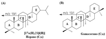 ![]() Figura 1. Estruturas representativas dos terpanos pentacíclicos com esqueleto hopano (A) e nao-hopanóide (B)